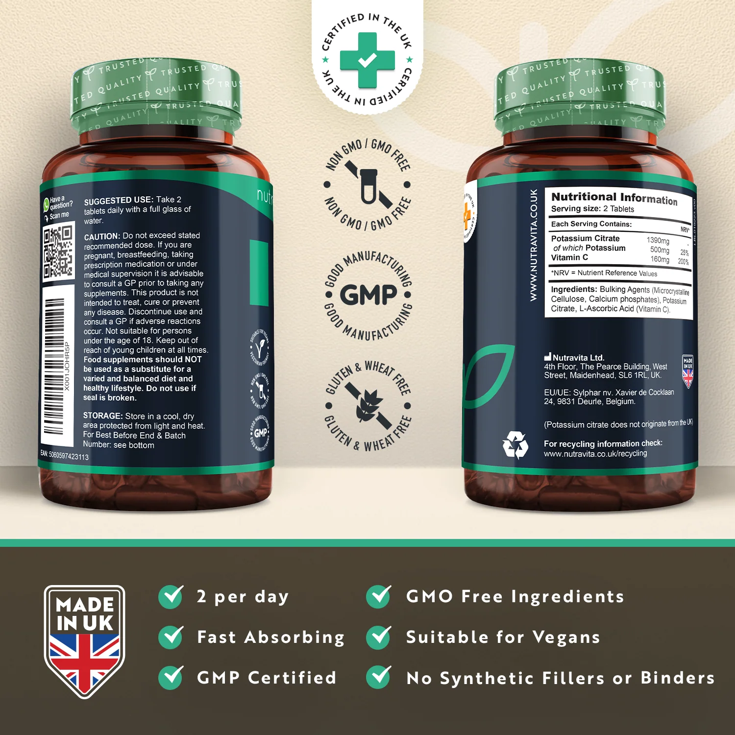 Our supplement contains 1390mg Potassium Citrate per serving, of which 500mg is potassium and counts for 25% of your NRV (Nutrient Reference Values). Our supplement is designed to be suitable for men and women, and is also free from GMO, nuts, gluten, lactose and wheat.