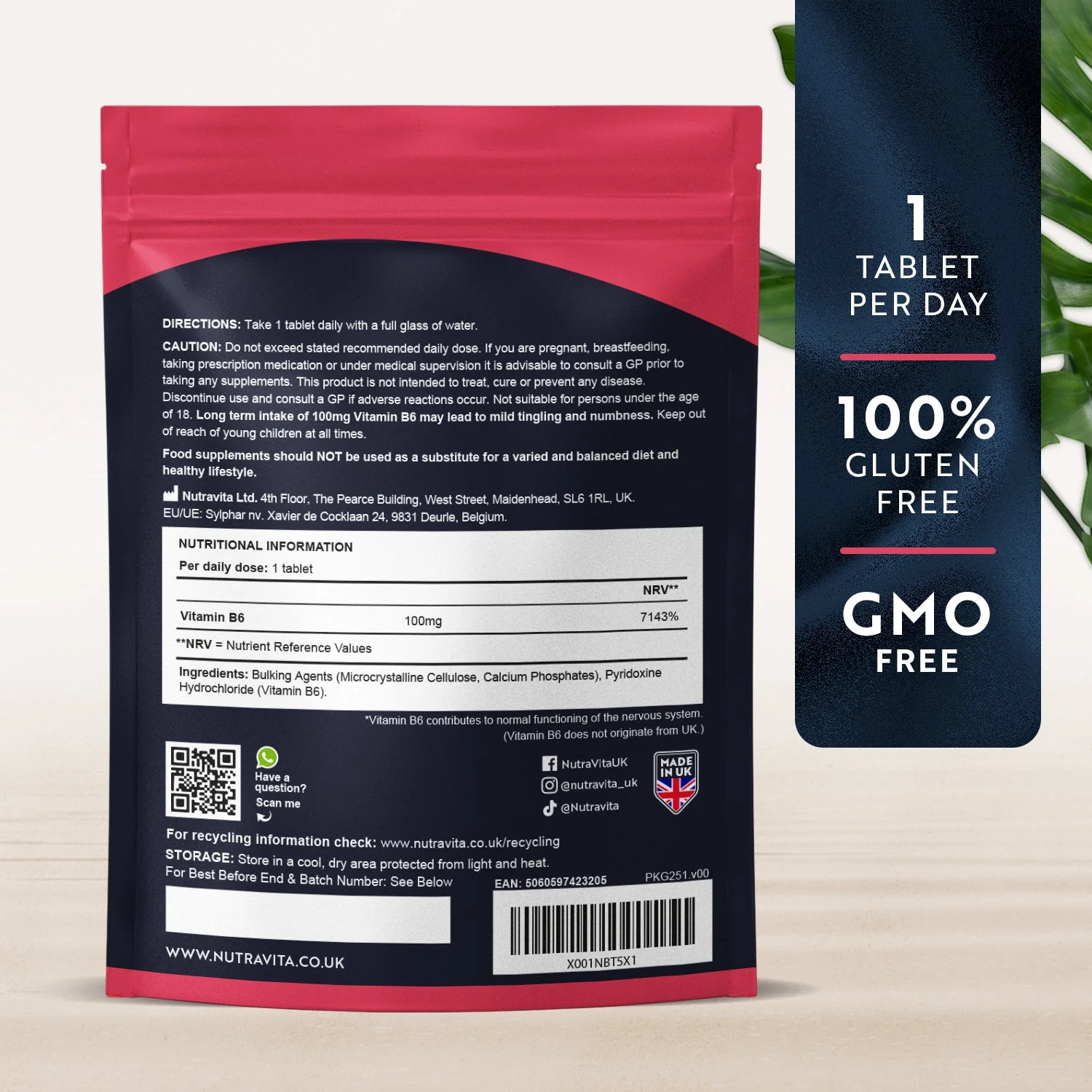 Our Vitamin B6 supplement comes with a 4 months supply of 120 easy to swallow tablets. Our 100mg Vitamin B6 tablets offer several health benefits including support for the nervous system.